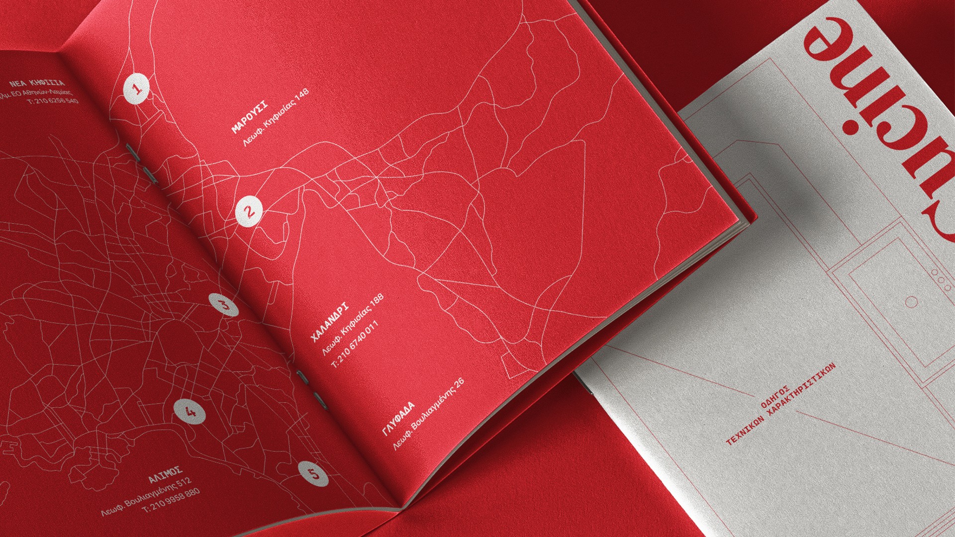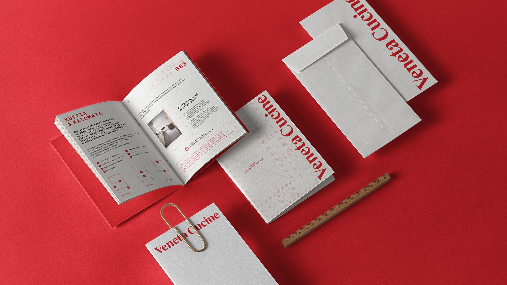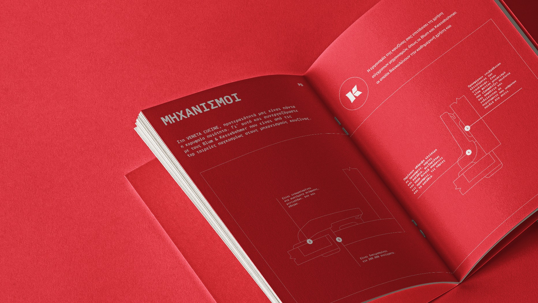 Guided by the PR duo Ioanna Daskaroli and Nikos Stroggylos, the design proposal for the Veneta Cucine in-store catalogue drew inspiration from the language of architectural drawings — fine lines, geometric bounding boxes, legends, and monospaced typographic elements. These details, paired with the signature Veneta Cucine Rosso Red, came together to create a cohesive and distinctive catalogue.